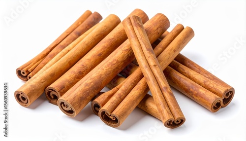 Cinnamon sticks arranged diagonally on a white surface, showcasing their texture and form.