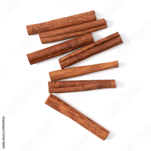Cinnamon sticks isolated on white background closeup. Canella spice. Aromatic condiment background. Flat lay, top view.