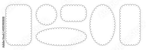 Circle and square scalloped frames. Scalloped edge rectangle and ellipse shapes. Simple label and sticker form. Flower silhouette lace frame. Vector illustration isolated on white background.