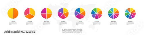 Circle division vector infographics icon set from 2 to 9. Different color circles chart divided 2, 3, 4, 5, 6, 7, 8, 9 equal parts. Business round diagram with same size sectors, fraction.