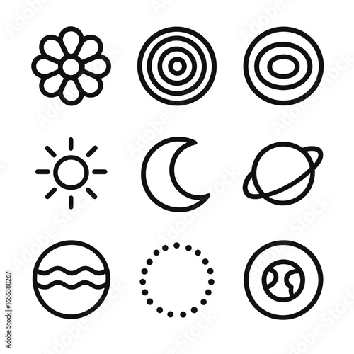 Circle Nature Icons. Solid, filled icon set of circle in nature: flower petal, tree rings, water ripple, sun, moon, planet,