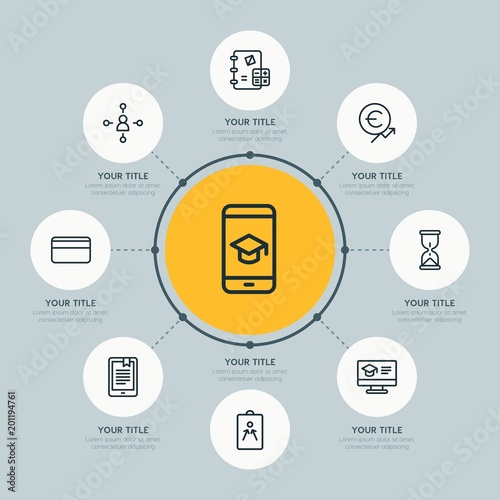 Circle network chart business, money, education infographic template with 8 options for presentations, advertising, annual reports.
