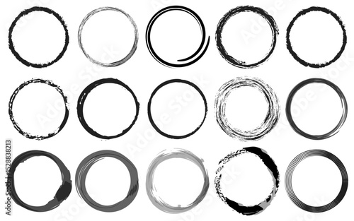 Circle splat brush stroke set hand drawn grunge black shape paint frame collection dirty ink strokes silhouette vector illustration border element damaged grainy spray paintbrush