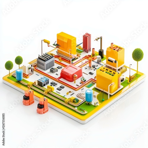 circuit board concept. Colorful 3D cityscape model featuring buildings, roads, and industrial elements.