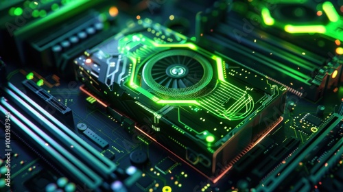 circuit board, graphics card, technology, green glowing lights, close up view, futuristic design, digital components, electronic devices, tech background