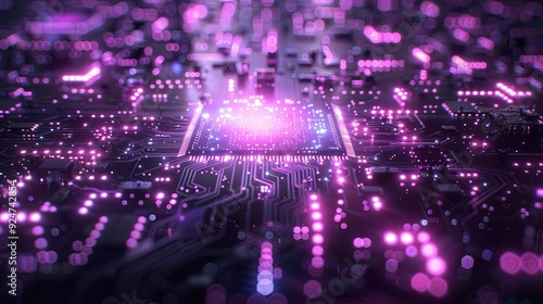 Circuit board microchips with pink and purple backlight. Nanotechnology sustainable background.