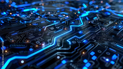 Circuit board with blue lights glows, creating a complex and futuristic pattern. Ideal for tech themes or digital presentations.