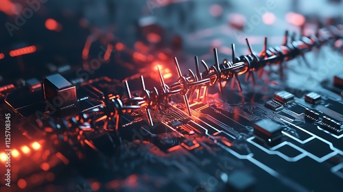 Circuit board with glowing barbed wire, symbolizing difficulty and pain in advanced technology