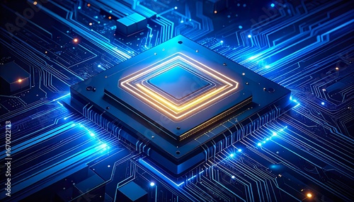 Circuit board with glowing microchip and blue light effects showcasing advanced technology