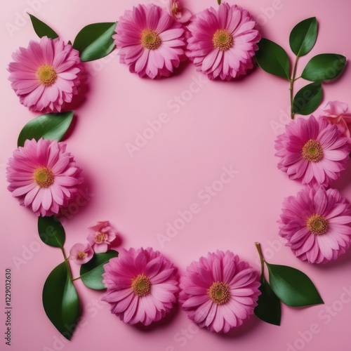 Circular arrangement of pink daisies with green leaves on a pink background, AI generated