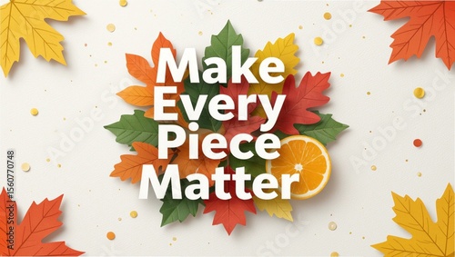 Circular arrangement of red, orange, yellow, and green paper cut leaves with bold white text and an orange slice on a light textured background.