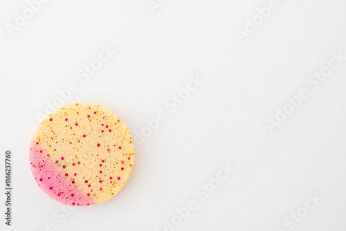 circular exfoliating scrub sample floating on pristine white surface