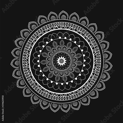 Circular Floral Mandala Pattern in White Line Art on Black Background.