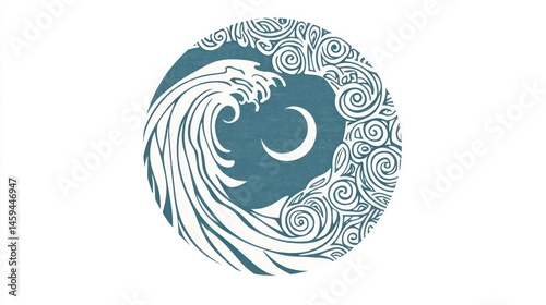 Circular ocean wave art with crescent moon
