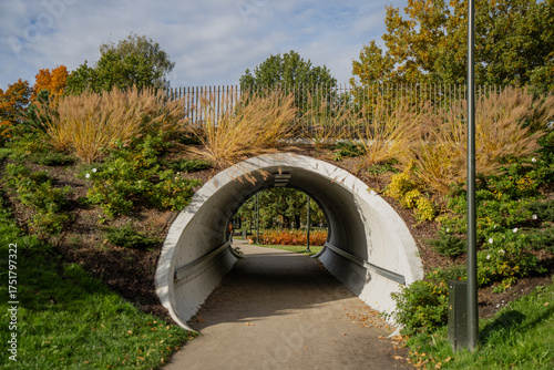 Circular park tunnel surrounded by grass and plants representing harmony between modern city architecture and nature creating inviting space for recreation and outdoor relaxation
