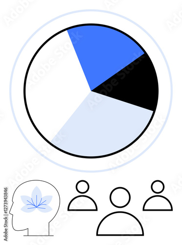 Circular pie chart with four segments, head with floral brain symbol, and three abstract human figures. Ideal for data analysis, teamwork, mental health, education, research, creativity abstract