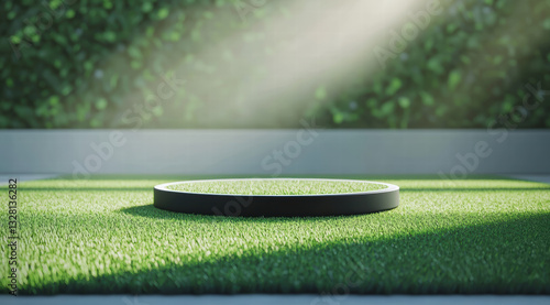 circular platform on green grass illuminated by soft light, creating serene atmosphere