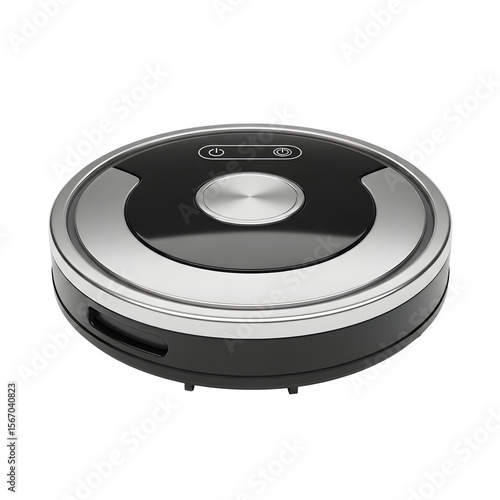 Circular Robotic Vacuum Cleaner Isolated on Black Background with Metallic Accents and Digital Display