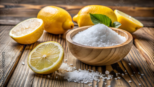 Citric acid, also known as lemon salt, presented on a wooden background, either in a wooden bowl or loose