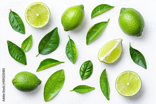 Citrus limes flying in the air with cut slices and green leaves isolated on a black background.