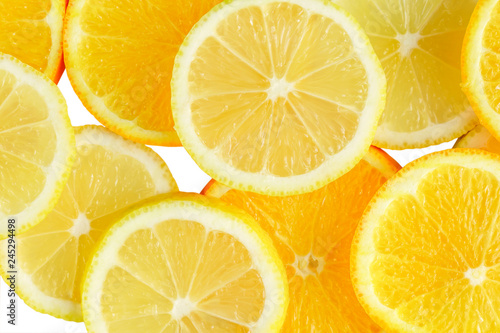 citrus slice, oranges and lemons on white background. Fruits backdrop