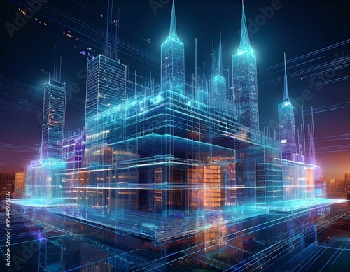city at night,Futuristic Architectural Design Projection Overlay on City Block Under Construction at Night, Wireframe Hologram Building Visualization,night, city, traffic, road, street, highway, urban