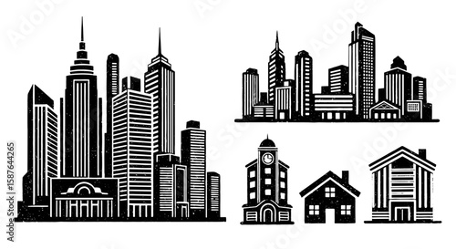 City buildings sketch vector set. Hand drawn doodle building elements in ink brush style. Simple abstract house silhouette for architecture black paint art. Vector illustration
