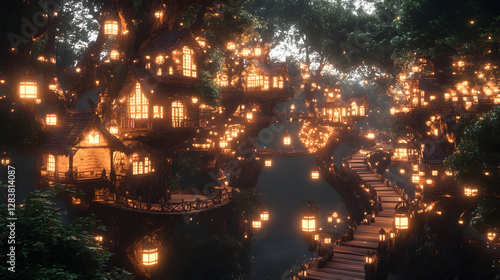 city built on massive tree branches with glowing lanterns and winding wooden bridges