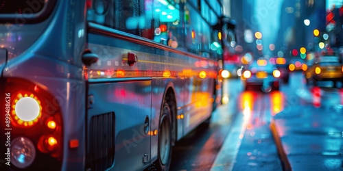 City bus navigating through evening traffic with vibrant lights, showcasing urban transit and city hustle at night.