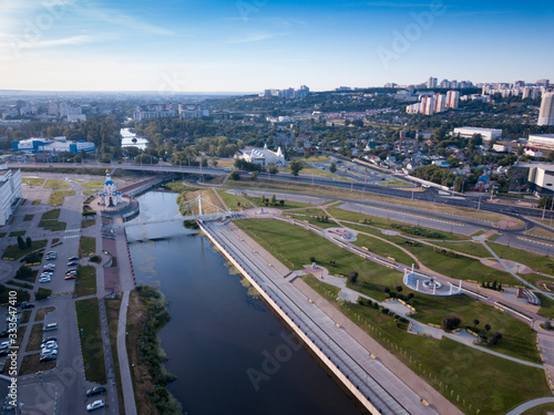 City downtown building in sunny morning, aerial view
