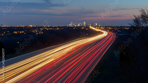City Highway Night Traffic Lights And Trails With Blurred Motion And Dark Sky
