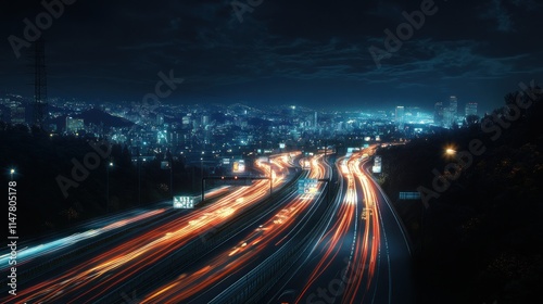 City highway with long exposure light trails at night.