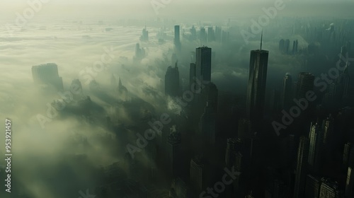 City in the Clouds: Aerial View of Fog-Shrouded Skyline