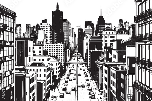 City landscape. Different buildings on street, outline cityscape hand sketch, flat houses. Hand drawn vector illustration