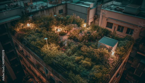 City life illuminated by street lights and modern architecture at dusk generated by AI