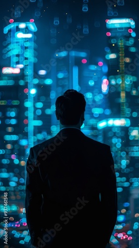 City Lights & Dreams A lone businessman contemplates the glittering cityscape, bathed in the soft glow of city lights. His silhouette against the urban panorama evokes ambition, determination, and th