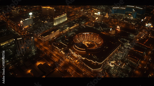 City lights illuminate a bustling entertainment district at night in Las Vegas