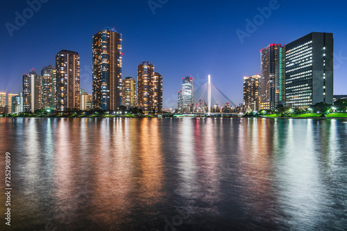 隅田川の夜景 佃島の高層マンション群と中央大橋【東京都・中央区】 City night view of the Sumida River - Tokyo, Japan