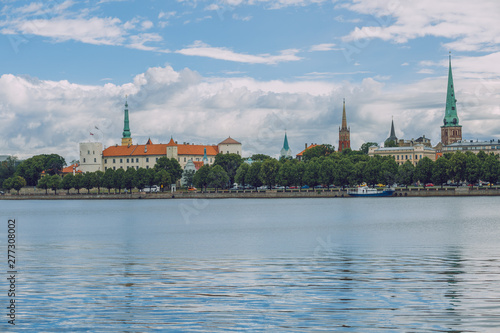City Riga, Latvia Republic. View to old city and river Daugava. Urban city in summer. July 4. 2019 Travel photo.