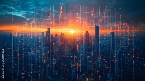 City skyline at dusk, financial district, stock market graphs and charts overlay, blue tones, orange sunset sky, glowing skyscrapers, double exposure effect, digital data.