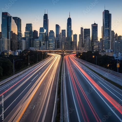 City Skyline at Dusk with Highway Traffic Light Trails