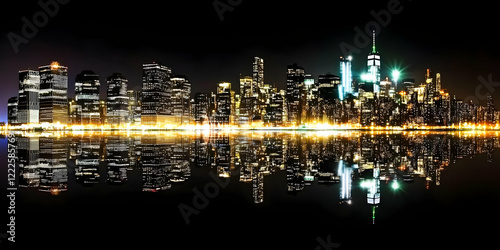 City Skyline at Night Reflects in Water with Lights Shining Brightly Across Buildings