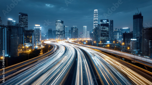 City skyline at night with illuminated skyscrapers and light trails from moving vehicles