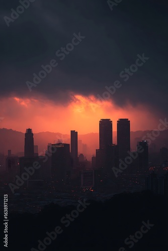 City skyline at sunset, silhouetted against a dramatic sky.