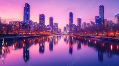 City skyline reflecting in calm river at sunset with vibrant purple sky