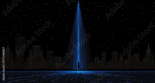 City skyline with a blue fountain in the middle. The city is lit up at night, creating a beautiful