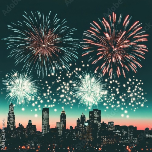 City skyline with fireworks lighting up the night sky, celebration scene, 3D illustration illustration 3D background, no blur, photo not dark, everything is clear, copy space