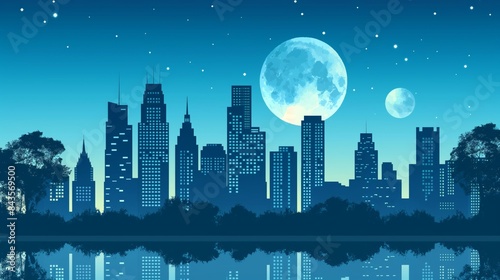 City skyline with full moon and stars reflected in the water