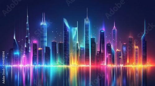 City skyline with neon lights, futuristic buildings. Skyscraper futuristic city.