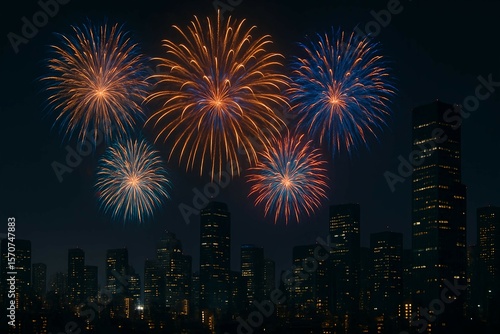 夜景の高層ビルと打ち上げ花火|City Skyline with Night Fireworks